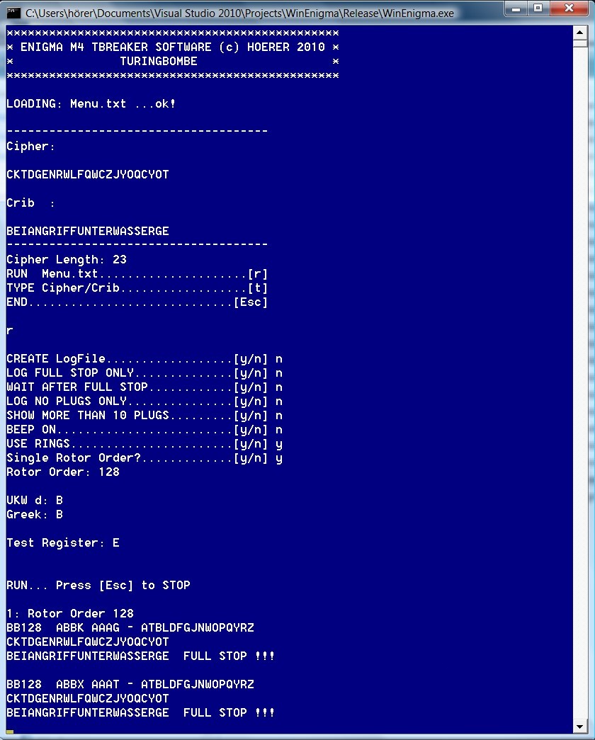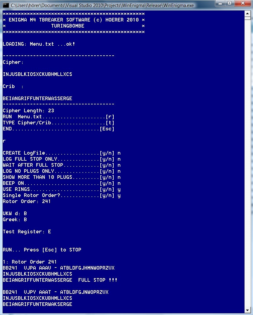 ![]() First test: A break of the famous LOOKS message from the M4 Project. At the original key settings. The TB used a 23 character wide crib! The crib also had a Mid-Rotor turnover! --> WinEnigma finds the correct fast ring! |