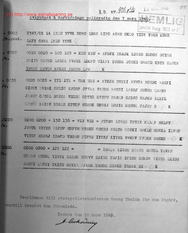 Example Page 40While searching for information about the Allies’ code-names for different Enigma key-nets, I found an interesting PDF document. It contains a number of radio messages intercepted by the Swedish security police in December 1939 and in February, March and April 1940, including more than twenty intercepts that, judging from their formats, are almost certainly naval Enigma messages; and also a few that look like either German Army (Heer) or Air Force (Luftwaffe) messages. The naval Enigma intercepts are on pages 22, 23, 24, 25, 37, 39, 40, 47, 49, 69, 70, 71 and 81 of the PDF; and the five Heer/Luftwaffe intercepts are on pages 40 and 47. Most of these were intercepted by the police radio station at Norrköping. The pages of the PDF seem to run in more or less reverse chronological order — for example, the intercepts on page 40 are from the 7th of March 1940, and those on page 47 are from the 20th of February 1940.