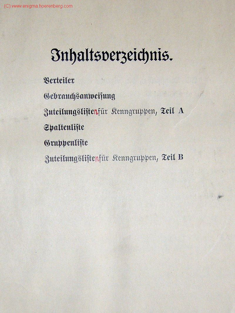 ![]() Table of contentInhaltsverzeichnis Kenngruppenbuch (Table of content: German naval K-Book for Enigma and RHV) |
