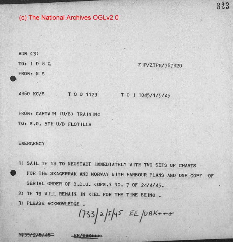 SEHR SEHR DRINGEND [An] Chef 5. U-Flott: 1) Torpedofangboot 18 mit 2 Stellkarten Ausrüstung Skagerrak und Norwegen mit Hafenplänen und 1 Exemplar laufende Befehl B.d.U. Op. Nr. 7 vom 24.4.45. sofort Neustadt in Marsch setzen. 2) Torpedofangboot 19 vorläufig Kiel bleiben. 3) Bestätigung erbeten. [Von] F.d.U. Ausb. | |