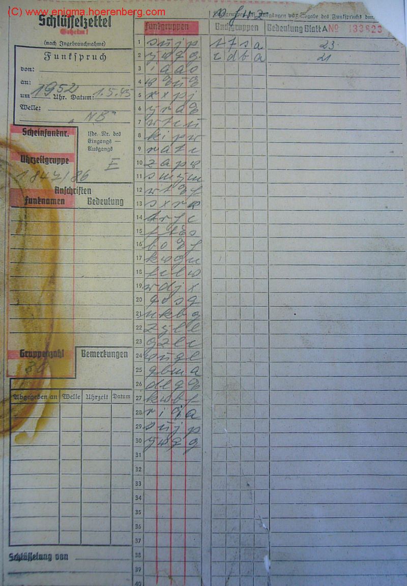 Spruchschlüssel von F.T. mit Uhrzeitgruppe 1224 sofort hergeben, da F.T. nicht zu lösen. [Von] Funkleitung