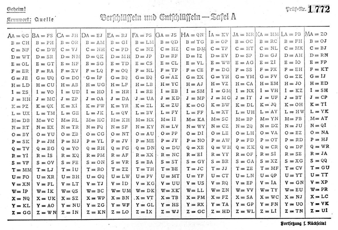 ![]() Tauschtafel ASuppose the "Doppelbuchstabentauschtafel für Kenngruppen" (bigram substitution table(s) for indicator groups) of the day is "Quelle" Tafel A. We got this information from the Tauschtafelplan für Kenngruppen (table selection chart). We take the letters in pairs vertically and look them up in the Tafel A. BJ = MC JM = BP KK = JQ GX = TB |